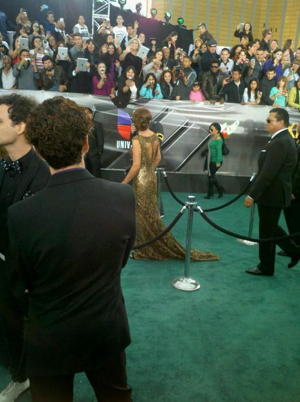 LUCERO DESFILA CON SU VESTIDO COLO DORADO ALFOMBRA VERDE